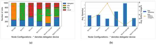 In this experiment, the role of the devices D1 and D2 have been switched, so that D2 is the delegator and D1 is a P2P edge worker. When D2 acts as the delegator, and works with other workers F1, C1, and D1, the jobs can be completed with an average speedup of 2.72, as shown in the node configuration D2*+F1+C1+D1 in Figure 4b. The average task completion time for this experiment was 382,891 ms. On average, out of 1000 jobs, D2 completed around 400 jobs and is the dominant node, as shown in Figure 4a. It is followed by F1, which completed around 349 jobs. C1 completed 203 jobs and D1 is the weakest of all, completing only 48 jobs.
