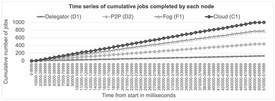 In this experiment, a comprehensive 3-tier configuration, comprising a P2P edge device (D2), a fog server (F1), a cloud server (C1), and the delegator (D1), collaboratively processes the tasks. This integrated architecture achieves a significant speedup of approximately 7.5, as documented in Figure 4b. The average task completion time for this experiment was 514,485 ms. D2 and F1, being the fastest workers, are able to complete almost two-thirds of the total jobs (Figure 4a). Figure 5 illustrates the cumulative number of jobs completed (y-axis) over time in milliseconds (x-axis) for each node (D1, D2, F1, C1). The lines represent the total number of jobs completed by each node at any given point in time. The gap between the lines provides an indication of how many jobs each device has completed relative to the others, with a larger gap signifying a higher contribution.