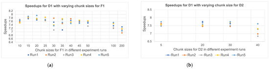 Experiment 7: Varying the chunk size. (a) Speedup gains for the D1 with varying chunk size for F1 and constant chunk size for nodes D2 and C1. (b) Speedup gain for the D1 with varying chunk size for D2 and constant chunk size for nodes F1 and C1.
