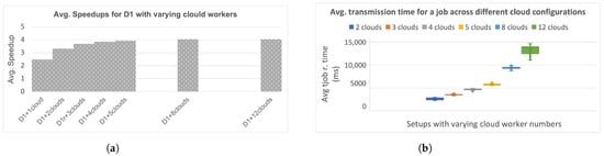 From Figure 7a, it can be seen that the system performance increases with the addition of cloud workers. However, the returns plateau after five cloud servers. From that point onwards, the speedups remain stable even though more cloud workers are added. This can be explained in that having more workers increases the job distribution/transmission overheads, as illustrated in Figure 7b. With an increasing number of cloud workers, the average transmission time for a job increases. As long as this transmission overhead is offset by the benefit of increased computing resources, the system could continue to have increasing speedups. However, it is evident from Figure 7a that the point of diminishing returns for this particular setup occurs at five cloud servers. This result with cloud workers is also consistent with the experimental results for P2P mobile workers investigated in [6], which highlights that regardless of the type of worker (whether P2P edge/fog/cloud), there will be an optimal number of workers for a given job setup.