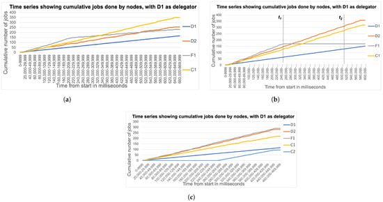 Experiment 10: Results for D1 working with D2, F1, and C1 under dynamic conditions. (a) Time series of cumulative jobs completed by the nodes: Slowing down F1. (b) Time series of cumulative jobs completed by the nodes: Disconnect F1. (c) Time series of cumulative jobs completed by the nodes: Add new cloud worker.
