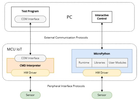 Python [17] is often regarded as a high-level programming language offering significant abstraction, yet it also proves to be an excellent tool in hardware development. MicroPython, an open-source, scalable port of CPython’s reference implementation, is designed specifically for microcontrollers on various target platforms. Its popularity is evident, with around 2000 different forks on GitHub, each with useful modifications for various development and experimental boards [17]. In practice, using MicroPython is straightforward: its firmware is loaded into the microcontroller’s flash memory through standard programming software (often known as a “flash-tool”) for the specific type of microcontroller and typically communicates with a computer terminal via a serial interface emulator [18]. A simplified comparison between the architecture of classic development platforms and those based on MicroPython is illustrated in Figure 2 [18].