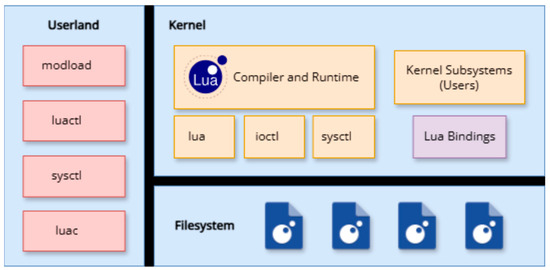 Implementing the Lua interpreter at the kernel level of operating systems such as NetBSD, as shown in Figure 3 [21], and Linux marks a notable step towards creating scriptable operating systems that allow users to dynamically extend kernel functionality. This is achieved by embedding Lua as a scripting language and writing scripts that can directly interact with the kernel. The approach involves modifying kernel subsystems to invoke the Lua interpreter, giving scripts control over various kernel operations, such as CPU frequency scaling and network packet filtering. This integration not only enhances operating system flexibility, but also facilitates rapid development and experimentation with new kernel algorithms, allowing developers to quickly test and deploy new functions without extensive recompilation or system shutdowns [21].