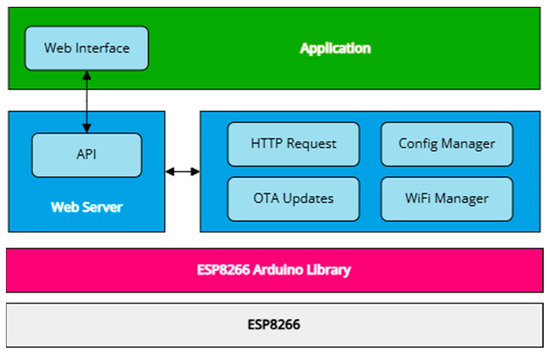 The following sections will explore the implementation of the ESP8266 IoT Framework [22,23], a customized framework designed to facilitate the development of IoT applications using the ESP8266 microcontroller. This framework addresses common challenges faced by developers, such as WiFi connection management and HTTP request handling, and provides a user-friendly web interface for configuration. Additionally, the application of a configuration manager will be described in detail, enabling the dynamic management of device settings, along with key components such as web server, WiFi Manager, HTTP request handler, and OTA updates. The Ewings Framework [24], an advanced software package that builds on Arduino ESP8266 libraries, will also be presented, offering additional features and services that simplify IoT application development, especially in the implementation of web services with advanced content filtering and user interface generation.