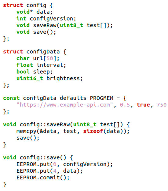 The persistence of user-defined settings is achieved through functions that save and load configuration data to and from EEPROM (Electrically Erasable Programmable Read-Only Memory), which retains settings even when the device is powered down, an example of which is shown in Figure 5 (implemented as part of this study). When users modify settings through the web interface, these changes are recorded and saved, ensuring that updated configurations are stored and available at the next power-up. The web interface plays a vital role in the configuration manager’s functionality, as it is dynamically generated based on the JSON file [23]. This allows users to view and modify configuration parameters in real time. When changes are submitted, the configuration manager processes them anew, enabling seamless interaction that simplifies the process of customizing device settings. This component thus enhances the flexibility and user experience of the ESP8266 IoT Framework, making it easier for developers to create adaptable IoT applications.
