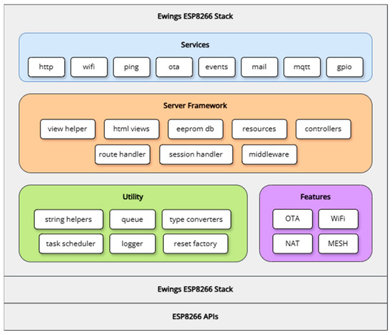 The framework also supports OTA firmware updates through its OTA service, offering remote device management and updates without needing physical access to the device. The ESPNOW Service enables mesh networking and broadcasting capabilities, using the ESPNOW feature of ESP8266 for efficient device communication. The WiFi Service provides simplified APIs for dynamic interaction with WiFi devices, including support for internet connections and dynamic subnetting. The PING Service extends basic ping functionality, allowing developers to check active internet connections, and the GPIO Service interacts with GPIO pins for sensor reading and device control, while the MAIL Service uses SMTP to send emails directly from the device, requiring SMTP configuration details. Additionally, the GPIO Alerts Service provides a mechanism for sending alerts based on specific GPIO conditions. All available services, libraries, and utilities are presented in Figure 6 [24].