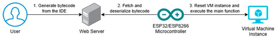 To address these limitations, researchers and developers have explored the use of virtual machines (VMs) and interpreters in embedded systems. Virtual machines provide an abstraction layer between hardware and software, enabling the execution of code that is not specific to the underlying hardware [3]. This abstraction facilitates the creation and use of a unified and often platform-independent design, simplifying portability and maintenance. Interpreters, on the other hand, execute code line-by-line, allowing dynamic code changes without the need for recompilation. This capability is especially useful where frequent updates or modifications are needed [2]. By using interpreters, developers can make code changes “on the fly” without requiring a complete system restart. Integrating virtual machines and interpreters offers several advantages: