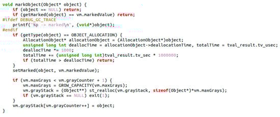 The performed stress test relies on allocation frequencies, sizes, and object retention times, defined using normal distribution and created for the VM instance as indicators for when a new object should be allocated, with byte number and the timestamp after which the object should be deleted by the GC. The mean value, standard deviation (sigma), and bounds are carefully defined to emulate typical allocation behaviours in an embedded environment. Specifically, the allocation frequency measured in seconds has a mean of 0.08 with a sigma of 0.03, without upper bounds, indicating a moderate allocation rate with some variability. Allocation sizes follow a distribution with a mean of 64 bytes and a sigma of 32 bytes, constrained by a minimum size of 16 bytes to reflect common memory usage patterns. The duration parameter, with a mean of 1 and a sigma of 2, has a minimum value of 0.1, simulating the typical retention time of allocated objects. During the tests, which ran for 20 min, the initial collection threshold was set at 1 KB. Memory allocation entries were imported as an array, where each entry created an instance of the “AllocationEntry” class. These instances were processed in the main loop using the integrated “millis()” function. When the current time matched the allocation time, a new object with the specified size was allocated. The garbage collection mechanism, upon reaching the next collection threshold, performed a marking phase that only marked objects whose retention duration had not yet expired. Consequently, only expired objects were deallocated, optimizing the garbage collection process. The implementation in Figure 17 illustrates an approach more suitable for Linux-based systems using the “timeval” struct from the “sys/time.h” library.