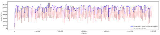 The results, as presented in Figure 18 and Figure 19, indicate that the garbage collector handled a total of approximately 957 KB of memory with an allocation rate of around 798 bytes per second and a frequency of 25 objects per second. The modified algorithm demonstrated stable performance and maintained a steady memory footprint, averaging 8.639 KB of used heap memory. The high throughput, calculated using Equation (1), reinforces this observation: