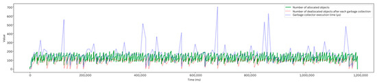 Changes in the number of allocated objects and execution times during garbage collector stress testing (authors’ contribution).