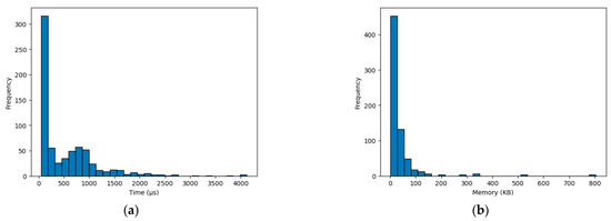 Deserialization, a process with arguably higher significance due to its interaction with new configurations, shows a median completion time of 964 microseconds and a worst-case scenario of 9.396 milliseconds. This elevated time requirement can likely be attributed to the additional tasks involved in deserialization, such as the allocation of new objects for functions and values. Furthermore, deserialization involves potential dynamic array resizing, particularly when initializing large pools for global variables or value maps. Although garbage collection could influence this process by deallocating resources, it is often deactivated during deserialization to prevent the premature removal of newly allocated structures, thus prioritizing stability over memory efficiency during the loading phase. Additionally, the two histograms provided in Figure 21 depict distinct distributions for time (in milliseconds) and memory usage (in kilobytes) during the serialization process. Both distributions are notably right-skewed, with most values concentrated at the lower end of the spectrum. The time distribution shows a pronounced peak between 0 and 500 microseconds, indicating that the majority of serialization tasks are completed rapidly, with only a few outliers extending up to several milliseconds. Similarly, the memory distribution reveals that most serialization tasks consume minimal memory, with the majority falling below the 50 KB threshold, while only a small number of cases exhibit higher memory demands. This skewness in both distributions underscores the efficiency of typical operations in terms of both execution speed and memory consumption, though the presence of long-tail outliers suggests certain high-complexity scenarios that require optimization to minimize resource usage.