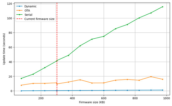 The results, depicted in Figure 22, reveal a distinct disparity between the different update methods as firmware size increases. The serial interface, due to its limited baud rate, demonstrated the highest update times, which escalated considerably as the firmware size grew. For example, at a firmware size of approximately 900 KB, serial updates required nearly 120 s to complete, highlighting the severe limitations imposed by low baud rates in serial communication. This outcome is expected, as the serial communication speed inherently restricts data transfer rates, particularly when dealing with larger firmware files. OTA updates performed more efficiently than the serial updates, maintaining a more stable update time across the tested firmware sizes. However, OTA updates incurred additional delays due to network variability and reconnection delays. Each OTA update required a network reconnection and a soft reset after the transfer, adding an average delay of several seconds, likely due to the overhead involved in establishing and securing the Wi-Fi connection for each update cycle. Nonetheless, OTA updates demonstrated consistent performance, with fluctuations largely attributable to network factors rather than the update mechanism itself.