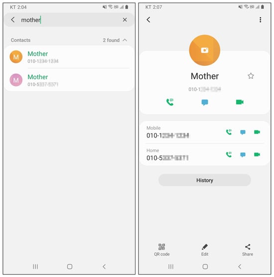 Android provides APIs that allow developers to retrieve, and modify contacts stored on a device. Vishing applications exploit these APIs to exfiltrate or modify contacts on a victim’s device for malicious purposes. Additionally, we introduce a malicious behavior called Duplicated Contacts. Duplicated Contacts involves adding the attacker’s number to the victim’s contact list under an existing contact name or editing it as a secondary contact. According to a FINLEY, Jason R., et al. [], many smartphone users store contacts on their devices rather than memorizing phone numbers, making Duplicated Contacts effective in tricking victims into thinking they are receiving a call from someone they know. Android users overlook the actual number displayed beneath the contact name, and iOS users do not see the number at all, allowing attackers to exploit this limitation.
