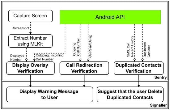 The Sentry of Ventinel operates in the background to monitor the malicious behavior of vishing applications. It utilizes Android APIs to gather various types of information, such as incoming and outgoing numbers, to verify the presence of malicious activities. Sentry detects specific malicious behaviors, including Call Redirection, Display Overlay manipulation, and Duplicated Contacts. When the Android device is on IDLE and not engaged in a call, Sentry performs a Duplicate Contacts Verification. Upon the user’s attempt to initiate a call, Sentry conducts a Call Redirection Verification. Following this, Sentry carries out a secondary check through Display Overlay analysis. It captures the screen displayed by the device during both incoming and outgoing call states and performs a Display Overlay Verification to detect any potential malicious activity.