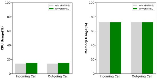 We evaluated the overhead to understand how Ventinel impacts the user’s device when activated. Using a Galaxy Jean device, we compared CPU and memory usage with and without Ventinel running. When Ventinel was not running, CPU utilization averaged 14%, and memory usage was 74.2%. With Ventinel running, CPU utilization increased slightly to 15%, while memory usage remained unchanged at 74.2%. These results indicate that Ventinel does not cause any noticeable performance degradation on the device. Further details are provided in Figure 3.