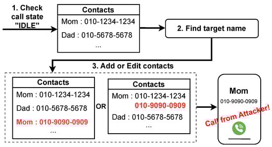 With the proliferation of vishing applications, the most commonly observed attack methods have been the Call Redirection Attack and the Display Overlay Attack []. Firstly, the Call Redirection Attack involves redirecting the number dialed by the user to the attacker’s phone number. However, since the attacker’s phone number would appear on the user’s outgoing call screen, this method is often combined with a Display Overlay Attack for added deception. The Display Overlay Attack, on the other hand, is used to conceal the attacker’s phone number by overlaying a fake waiting screen during incoming or outgoing calls []. By masking the real phone number with a counterfeit screen, users are less likely to notice discrepancies, thereby increasing the likelihood of them divulging personal information without suspicion. Additionally, we defined a new attack: Duplicated Contacts Attack. This attack involves registering the attacker’s phone number under a contact name that matches a target contact’s name or editing an existing contact on the target’s device to insert the attacker’s phone number.