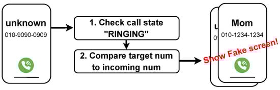 Android supports APIs that facilitate the output of specific pop-up screens or full-screen displays, known as Display Overlay [,]. Vishing applications exploit these APIs to perform malicious activities by using Display Overlay to cover the victim’s device screen with a fake interface, thereby deceiving the victim about the outgoing caller ID. Specifically, when vishing applications change the outgoing call, they overlay a fake screen to disguise the altered outgoing number display. When victims receive a call from attackers, vishing applications overlay a screen that appears to be from a legitimate institution (e.g., police, bank, public institution) to deceive the victim.