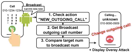 The Android platform provides various APIs (e.g., TelephonyManager API, LocationManager API, etc.) that request information from the device or manipulate it directly, facilitating flexible feature development for applications. Attackers exploit these APIs to create malicious applications, such as vishing applications. Google has recognized these issues and has been consistently implementing security patches [,], as well as removing APIs that were exploited by malicious apps, restricting the values that apps request from APIs, and requiring additional permission checks before app installation, among others. Specifically, Google introduced security patches in the API level 29 update to prevent the abuse of Call Redirection []. In this section, we introduce the alterations in Call Redirection and Display Overlay Attacks in vishing applications based on this security patch.