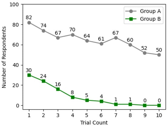 To validate the proposed technique, we recruited 100 participants for Group A, who received vishing applications, and another 100 participants for Group B, who were provided with both vishing applications and Ventinel. All participants used Android devices, with the Android version randomly selected. Participants were recruited under the pretext of a study unrelated to vishing, ensuring they would not recognize the functioning of the vishing applications. After the experiment concluded, we informed them about the study’s true nature and requested their participation in a survey regarding vishing. The experiment lasted one week, during which both incoming and outgoing calls were executed randomly. An incoming call was considered unanswered if the participant did not respond, while an outgoing call was counted as unanswered if the subject ended the call within five seconds after answering. As shown in Figure 7, Group A had an average response rate of approximately 64.7% across ten tests, whereas Group B exhibited an average response rate of only 8.9%. Each corresponding number represents the total number of responses in Group A and Group B divided by the number of trials. These results demonstrate that Ventinel effectively defends against vishing applications.