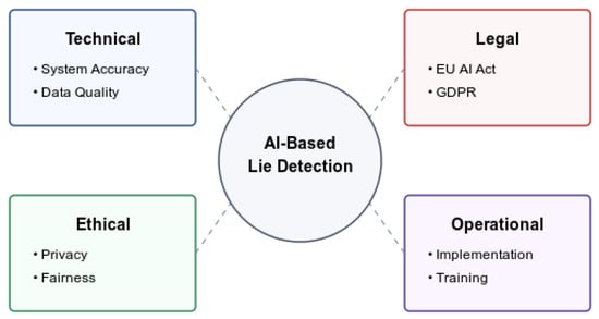 While AI-driven lie detection technologies have certainly made some promising progress within the challenging realm of reading micro-expressions, vocal patterns, and other behavioral biometrics, it needs to be pointed out that there are a lot of big challenges standing in the way for these potentially great systems, and these are likely to seriously undermine their overall effectiveness and reliability in real-world applications. There might also be technical constraints that could undermine the accuracy and performance of these highly complex systems. Beyond the technical and practical challenges that are intrinsic in the deployment of AI-powered lie detection systems, there are substantial ethical, legal, and societal concerns that must be addressed. Problems of privacy infringement, the need for consent, the potential biases within AI algorithms, and the grave consequences of accusing innocent people all demand a comprehensive and prudent analysis of the moral implications such technologies bring forth. Moreover, legal challenges will inevitably arise concerning the admissibility of evidence derived from an AI system in a court of law, together with the strict observance of the data protection regulations in place to ensure the rights and privacy of individuals are well protected. This section provides an in-depth look into the various and intricate challenges and considerations that surround the topic at hand. It takes a comprehensive look at the current countermeasures to be found in response to lie detection technologies and explores the important ethical, legal, and societal implications of the application and use of such technologies. In so doing, we hope to provide a well-rounded understanding of the underlying complexities and nuances associated with both the advancement and the practical implementation of artificial intelligence lie detection systems. The subsequent table presents the AI threats specific to AI lie detection systems, as well as the vulnerabilities and security controls related to them. Before the Table 2, Figure 3 highlights significant challenges faced by AI-based lie detection systems, categorized into technical, legal, ethical, and operational. Technical challenges stem from system accuracy and data quality issues, while legal challenges arise from compliance with the EU AI Act and GDPR. Ethical considerations involve privacy and fairness, and operational challenges focus on training and implementation. These interconnected challenges, illustrated with dashed lines in Figure 3, reveal the complexity of deploying such technologies in real-world applications.