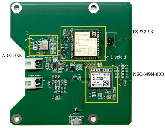 All components are mounted on a PCB, as shown in Figure 1. In addition to the main components previously described, each node in the network is equipped with two antennas; one is dedicated to a GNSS module and the other one, connected to the ESP32 microcontroller, is used for Wi-Fi communication. In addition, a temperature sensor is integrated into the node, providing critical environmental data for analysis.