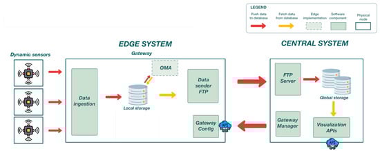 The proposed architecture is represented in Figure 2, consisting of two primary components: the edge system (Raspberry Pi) and the central system. Wireless sensors deployed across the bridge form a star topology around the edge system. The latter receives data from the sensors that collect data and send it to a data ingestion module. These data are stored locally in a database within the gateway, which acts as a hub for processing and management. Local computations, such as OMA analysis, are performed on the stored data. The gateway also includes a configuration module accessible via application programming interfaces (APIs), enabling remote management and customization of settings. Processed data are transmitted to the central system using an FTP data sender. Multiple gateways, each representing a different bridge, form a second star topology around the central server. In the central system, the received data are stored in a global storage database managed by a file transfer protocol (FTP) server. The central system includes a gateway manager for centralized control and coordination of edge gateways. Visualization APIs are employed to access and present the data from global storage, providing insights through user interfaces or other external systems. In Figure 2, the data flow is represented with arrows, where red indicates data being pushed to a database, yellow signifies data being fetched, and blue denotes API interactions. Physical components, software components, and edge implementations are distinguished visually in the diagram. This architecture is designed to enable efficient data collection, processing, and centralized management for high-frequency applications.