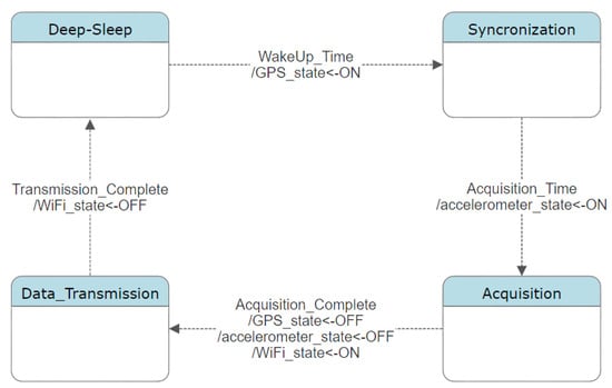 Upon the conclusion of the sending phase, each sensor node transitions into a deep sleep mode, a low-power state optimized for energy conservation. In this mode, the node deactivates nonessential functions and enters a state of dormancy. The duration of the sleep period is predetermined by the node’s internal clock, calculated based on a fixed interval established within the system architecture. Figure 3 gives a graphical representation of the evolution of the node state during the acquisition routine.