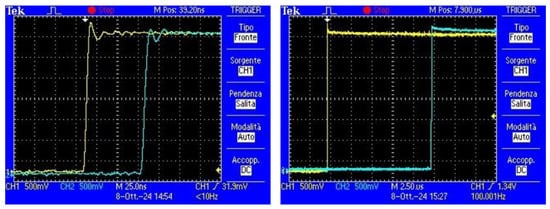 On the left, an example of two trigger signals acquired from different sensors. On the right, an example showing a trigger signal (yellow line) together with the subsequent data-ready signal (blue line).