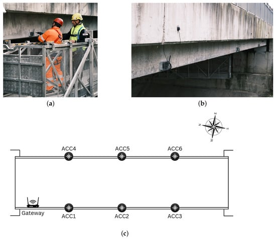 Mounting schema and photos of sensor installation on the real bridge. Subfigure (a) shows an operator during the mounting operations, subfigure (b) presents a close-up of the mounted sensors, and subfigure (c) illustrates the schematic representation of sensor placement.