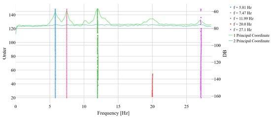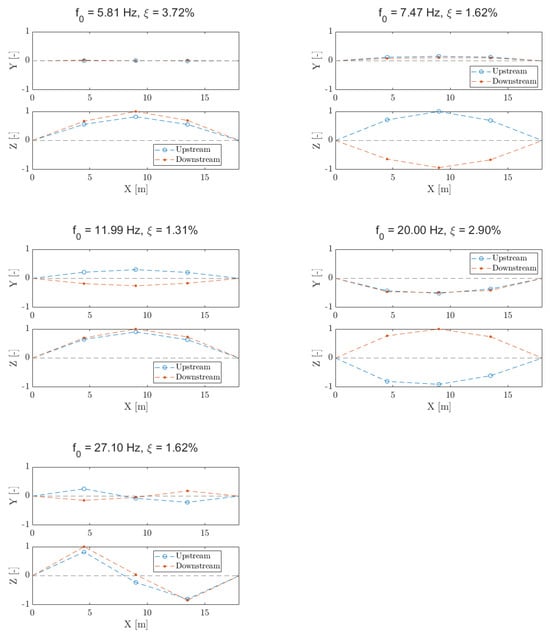 Additionally, in Figure 6, the first two principal components of the frequency domain decomposition (FDD) [] are represented to check the correctness of the SSI-COV estimation. In Figure 7, the resulting mode shapes are represented.