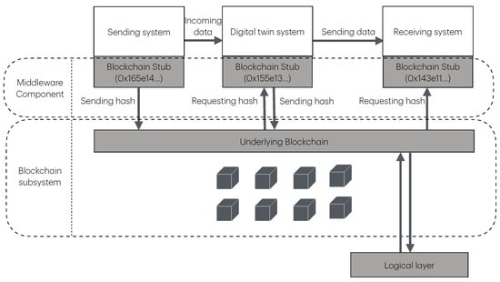 To further enhance the security of data transmitted to the blockchain component, a hashing mechanism is employed. The hash of the data is computed and transmitted alongside the signed transaction. In a hypothetical communication, the digital twin only accepts pre-validated information on the blockchain through the middleware component. Additionally, data transmission from the digital twin occurs only after undergoing an additional layer of validation. This approach ensures that the logical layer retains only the “fingerprint” of the shared information, enriching the overall data locality while minimizing the stored volume of data on the blockchain.