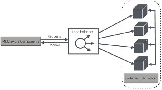 To address the challenge related to the uneven distribution of requests, the system involves the deployment of a load-balancing mechanism to evenly distribute the number of incoming requests across multiple nodes, as shown in Figure 3. The load balancer acts as a gateway for the middleware component and provide the appropriate address to communicate with the blockchain. Regarding the consensus protocol employed by the network nodes, which plays a critical role in determining system performance, a detailed analysis is presented in the results section (see Section 4).