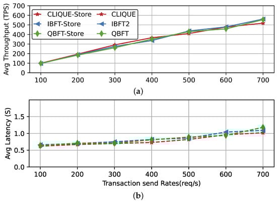 As shown in Figure 6a, the results of the tests indicated that the throughput values were generally similar across the three analyzed algorithms, with Clique exhibiting greater instability in the number of transactions approved. Regarding the latency in Figure 6b, the Clique algorithm slightly outperformed the others, showing a momentary equality when reaching 600 transactions per second. In comparison, both QBFT and IBFT 2.0 demonstrated nearly identical performance, with comparable latency times, reinforcing their similarity in terms of overall performance.