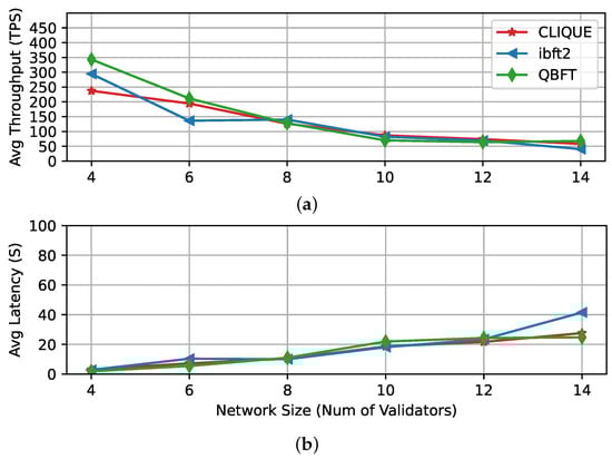 Performance of the different consensus protocols in increasing network’s size configurations. (a) Throughput plot with respect to the horizontal scalability. (b) Latency plot with respect to the horizontal scalability.