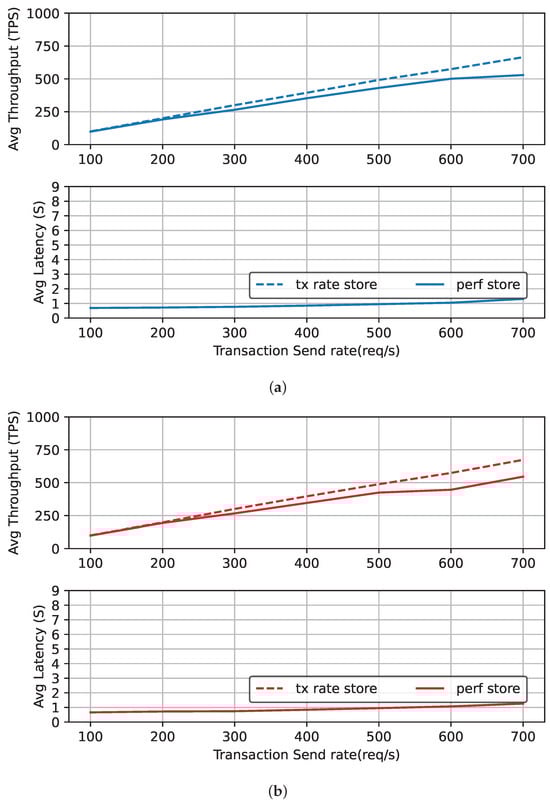 The transaction load began at a baseline of 100 TPS and progressively increased until it reached 700 TPS. The transactions involved were associated with the “send hash” functionality, which is designed to enable multiple concurrent connections to the digital twin system. This setup served as a practical scenario for assessing the network’s ability to handle varying levels of transaction demands while maintaining system efficiency.
