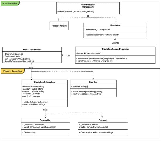 The legacy code written in C++ and provided by the developers of Tracker presents a complex structure originated from the necessity of extracting key information from the captured frames corresponding to the junctions of the recorded entities in the scene. A critical function of that module is the transformation of extracted data into structured JSON files, followed by their transmission to a designated Apache Kafka topic via an appropriate wrapper. The proposed hash validation architecture integrates with this process at the precise moment prior to data transmission through the Kafka topic. At this stage, the connection to the blockchain is initialized, and the data are stored within the smart contracts. However, due to compatibility issues with the C++ implementation of the Web3 library—used as a standard framework for the stub modules—a Python- wrapped solution was introduced. This solution, executed within the C++ code, was incorporated to enable communication with the system’s unified blockchain infrastructure and allow access to the validation system’s functionalities.