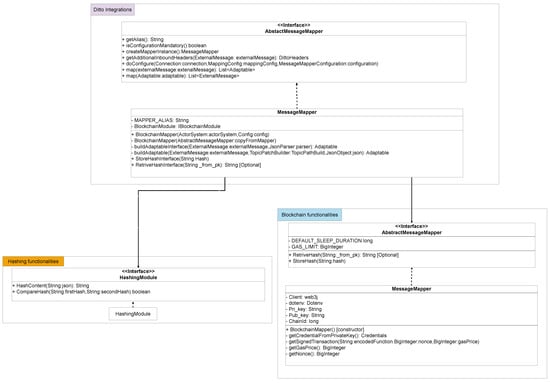 Instead, the proposed integration of the Ditto sub-module involved the extension of its connectivity capabilities through the development of a dedicated Java software component for filtering incoming messages. This integration methodology was chosen to enable more advanced functionalities required for interaction with blockchain technologies. In fact, at the time of this work, the module included a component responsible for receiving messages via the transmission medium and subsequently converting the corresponding messages into the Ditto Protocol format. This transformation process was achieved through the use of a JavaScript mapping function. However, the original implementation exhibited significant limitations, particularly in terms of extensibility and the ability to incorporate external libraries. To address the encountered issues, the integration of the sub-module involved the elaboration of a newly introduced mapping component. This was achieved by incorporating the functionalities of the sub-module into a custom mapper implemented in Java, which retained the original core functionality while extending its capabilities. The redesigned component built upon the original mapper and is visually represented through the scheme in Figure 11.