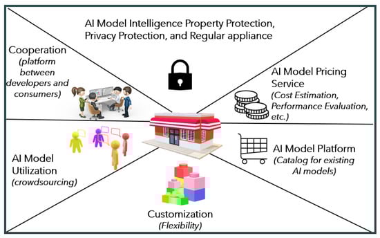 Based on the identified challenges above and the existing efforts summarized by Table 1, there is room for more efforts guiding the end-to-end design of an effective marketplace for AI models. To address these issues, this article aims to examine the unique characteristics of an effective AI marketplace, reviews existing AI marketplaces to identify areas that need improvement, and proposes a three-dimensional problem space to evaluate AI marketplaces from its efficient, secure, and user-centric perspective. Furthermore, the article emphasizes the importance of fostering collaboration between customers, developers, and the AI marketplace to ensure that AI marketplaces meet technical and business needs and adhere to ethical and regulatory standards [,,]. Similarly, a thorough review has been conducted across the various phases of the model development life-cycle to determine the ideal marketplace design that best fits AI models to improve overall efficiency.