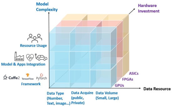Our study employs a three-dimensional problem space as Figure 2 to explore the potential for leveraging existing AI models with commonly shared functional capabilities. The analysis focuses on variations in data resources, potential hardware investment requirements, and labor resource utilization, highlighting the feasibility and implications of these factors in optimizing AI model deployment. For example, ChatGPT 3.0 is a text-to-text GenAI. Based on the problem space designed for the existing AI models marketplace (Figure 2), the data type is text only. The data acquired is public. The GenAI model uses VAE, TBM, and LM; therefore, the training AI model needs a large dataset. According to ChatGPT published data, for ChatGPT3, the pertaining dataset size is 45 TB []. Due to the extensive data requirements, ChatGPT relies on GPUs and ASICs to enable rapid response times and manage large-scale language processing tasks. Significant computational resources and multiple AI models are employed to fulfill performance requirements. Suppose a new AI product with similar functionality to ChatGPT is introduced. In that case, pricing for this model can be benchmarked against ChatGPT’s current pricing, such as a monthly subscription, which is recommended for the GenAI model itself. A model developed on top of ChatGPT, the recommended selling price would reflect ChatGPT’s base price plus an additional amount for any newly introduced features.