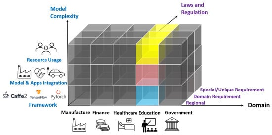 GenAI models are typically trained on extensive, diverse datasets, a process that demands significant computational resources, and data access is only available to leading technology giant companies, such as IBM, Google, OpenAI, and Nvidia. In contrast, specific AI or narrow AI products are targeted to finish one specific task. These tailored AI systems require specialized datasets, customized model architectures, and a focused alignment with operational requirements, making them fundamentally different from large, generalized GenAI models. Compared to the GenAI, specific AI heavily relies on specific datasets to train its model. Compared to the problem space designed for the existing AI models, the specific AI model is heavily affected by industry types such as higher education or government. Figure 3 demonstrates the AI trading market according to the different domains on which the AI model needs to focus. Its X-axis shows the domains in the AI model that need to be developed, such as manufacturing, finance, hospitals, education, and government. The Y-axis still focuses on the complexity of the AI model, and the Z-axis indicates the special policies or laws that need to be followed.