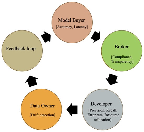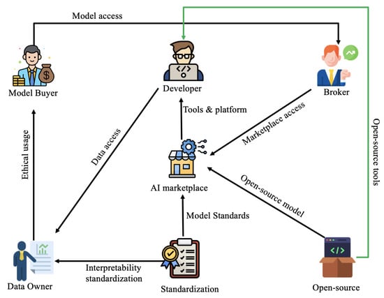 This subsection describes the value chain passed by the model in an ideal marketplace [,,]. The various components of this chain comprise the following: (i) Buyer: A market stakeholder joins the marketplace to purchase or license a model to address a specific use case requirement. Model buyers rely on brokers to provide reliable and high-performing models. (ii) Broker: The intermediary facilitating transactions between buyers, developers, and data owners. Brokers ensure smooth operations, compliance with marketplace regulations, and trust among the various stakeholders. AI marketplace can be used to take over a broker’s role to simplify the overall process. (iii) Developers: They are responsible for training models. They depend on data owners for high-quality datasets while collaborating with brokers to sell and distribute the trained models, and (iv) Data owner: He or she provides the required dataset for training models, playing a significant role in data quality, diversity, and ethical sourcing. (v) Standardization: It connects the various stakeholders (i.e., data owner, developer, broker through the marketplace) to enable interoperability, collaborative development, standards enforcement, and trust. (vi) Open source: It is linked to “Developer” and “AI Marketplace” to demonstrate the impact of tools, shared models, and the available resource pools for cost reduction, faster innovation, and transparent democratization of AI. Figure 5 depicts the relationships and dependencies among the various marketplace stakeholders.
