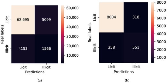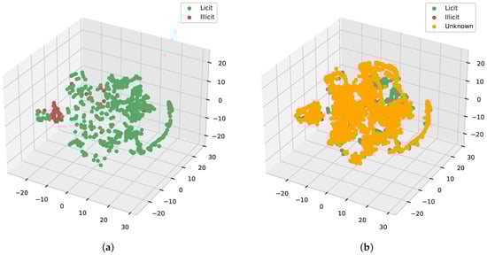 showed a cluster with a remarkable number of illicit transactions (4129), that same cluster also contained the majority of licit transactions (24,113), making it useless for the task of distinguishing between both labels. Conversely, both experiments conducted with