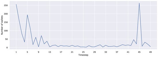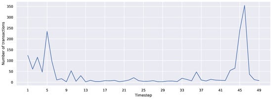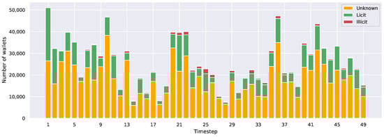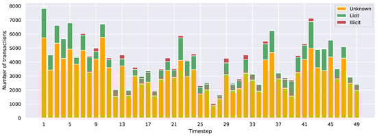 Figure 3 shows the number of transactions of every label (licit, illicit and unknown) at each timestep of the dataset, from 1 to 49. A high imbalance between different classes can be observed in the figure, and it is also remarkable that this imbalance varied from timestep to timestep with high volatility. Additionally,