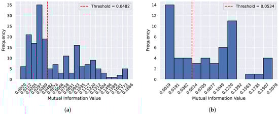 Section 4.2, the authors of the dataset do not provide such information. Although in both cases, the amount of mutual information was generally low, there existed slight differences between the features, which suggested that a component reduction algorithm could be beneficial for some models. On the first iteration, a feature ablation analysis was carried out by removing all the features below a threshold in the mutual information quantity. In order to select this threshold, a histogram was plotted for both transaction and wallet features to analyze the distribution of the mutual information values in both cases.
