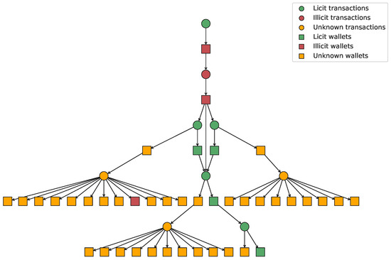 After analyzing the features, visualizing a sample of the transactions graph can be useful for understanding the Bitcoin flow between wallets, but its construction requires the selection of a node and the careful exploration of the graph obtained from it. More specifically, an illicit wallet was chosen as a starting node to ensure the existence of fraudulent entities in the subsample, and a Breadth-First Search-like algorithm was applied to it with a depth of three levels.