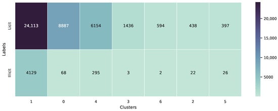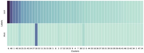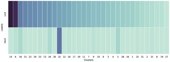 revealed a cluster with a large number of illicit transactions while keeping the number of licit ones low, as illustrated by clusters 10 and 30 in