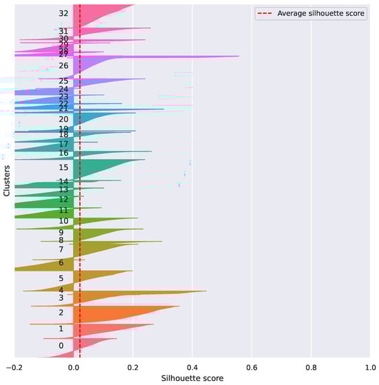 Figure 18 shows a very poor performance in terms of the silhouette analysis, with an average silhouette score close to 0. This indicates a low cohesion of the generated clusters and a generally bad clustering quality, suggesting that the features of the data, and especially the high dimensionality, hindered their clusterization.