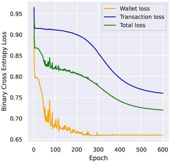 Section 4.3, a mini-batch training strategy was applied to fit the complex architecture of the HGT model into the CUDA device memory. The subgraphs corresponding to each timestep in the dataset were used as individual units for batching. In addition, the feature matrices of both transactions and wallets were normalized in advance. For the training phase, an Adam optimizer was utilized with a custom loss function that aimed to minimize the loss of both transactions and wallets, taking into account a custom parameter,