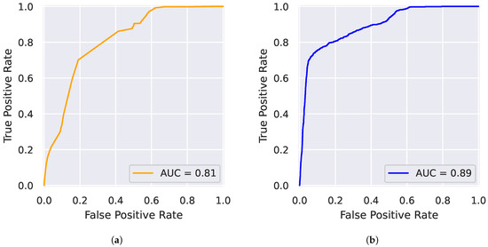 Although both confusion matrices show results that are not diagonal, it is important to take into account the class imbalance present in both sets. Therefore, it was expected to have a considerably large number of elements in the upper left quadrant of both matrices compared to the other quadrants. On the other hand, both ROC curves indicate correct behaviour, with an area under the curve (AUC) close to 1 in both cases.
