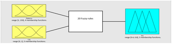 Figure 2 illustrates a Sugeno-type FIS architecture with two input variables and one output variable. The first input, labeled “Distance”, operates within a range of [3, 150] and employs four membership functions; the Gaussian combination membership function was chosen for the first input. The second input, “CSI”, spans the range [0, 1] and utilizes five membership functions; the Gaussian membership function was used for the second input. These inputs feed into a central processing block containing 20 fuzzy rules, which serves as the system’s inference engine. The output variable, marked as “”, is displayed in a cyan-highlighted box with a range of [0.4, 0.8], and comprises five membership functions; the Gaussian membership function was also used for the output. The entire system is connected through directional lines, demonstrating the flow of information from inputs through the fuzzy rule base to generate the final output.
